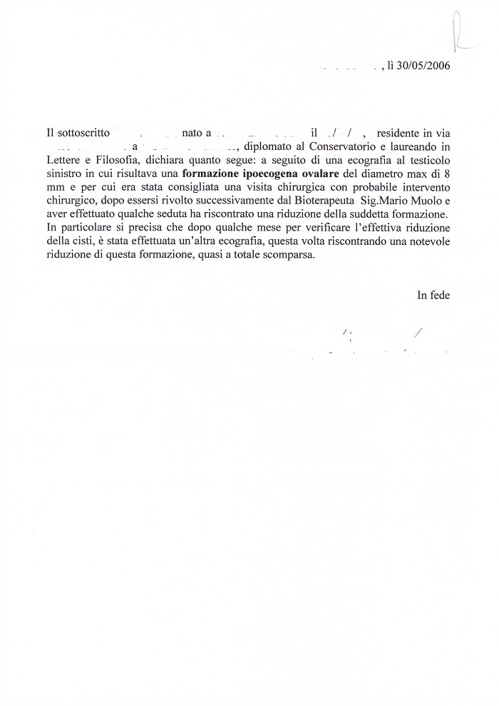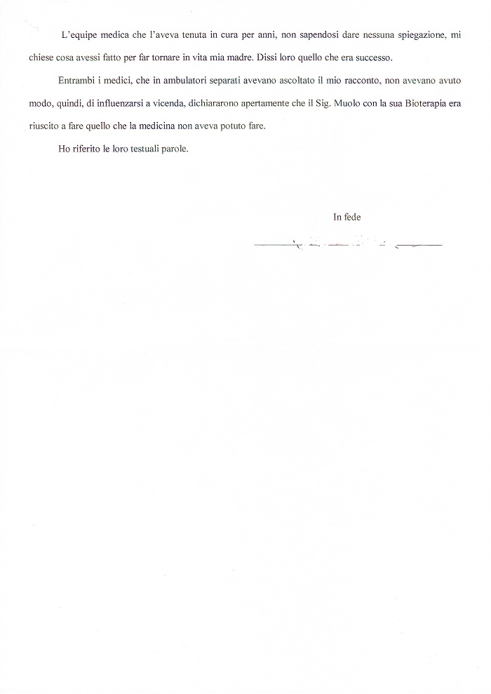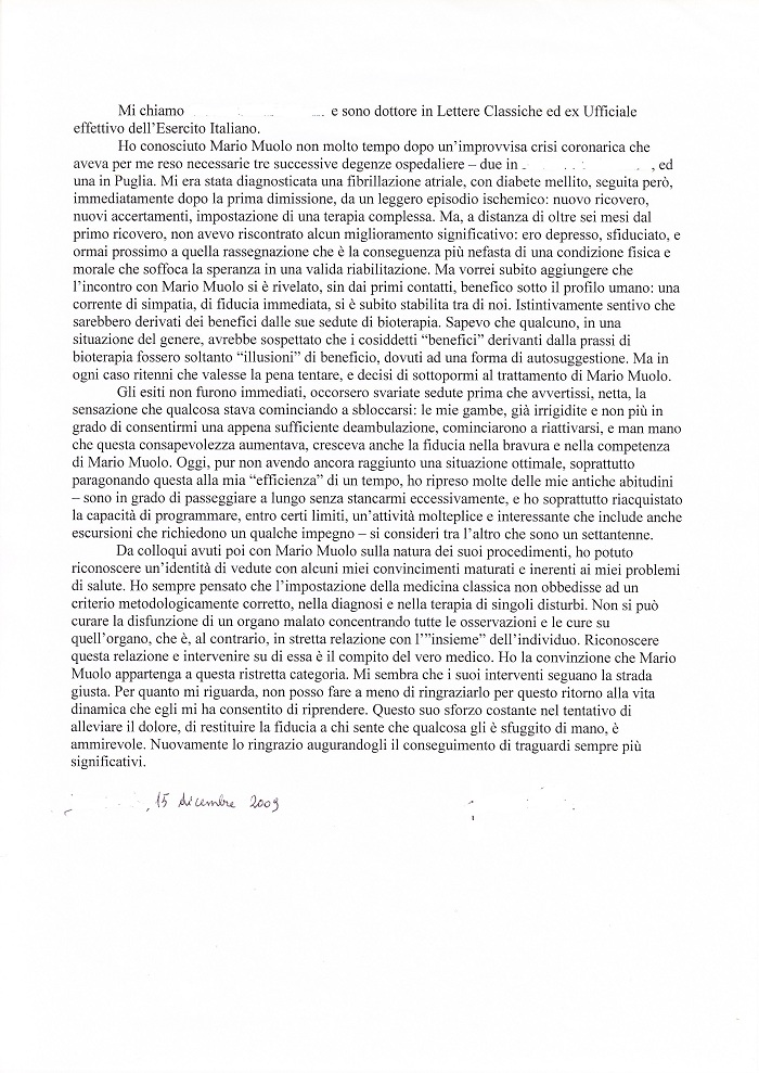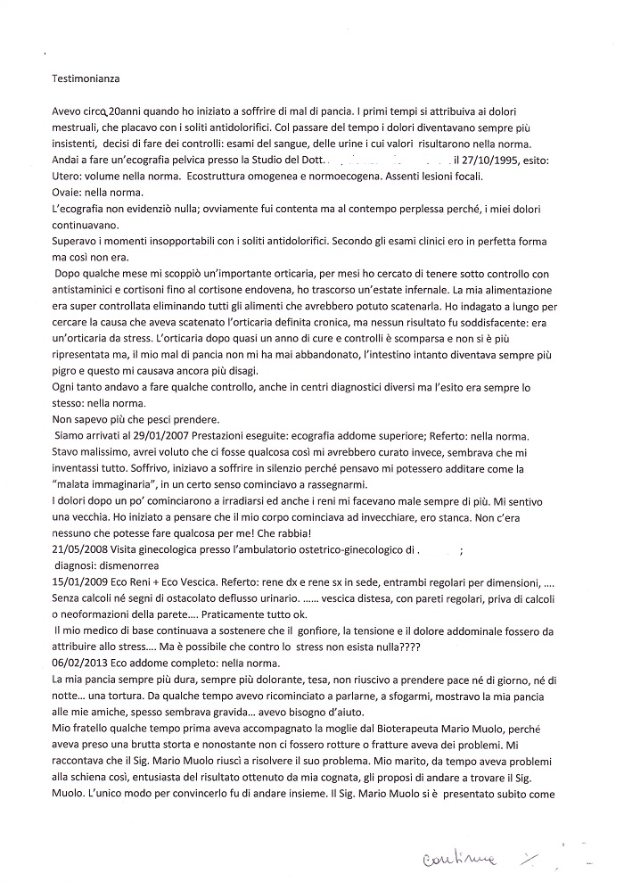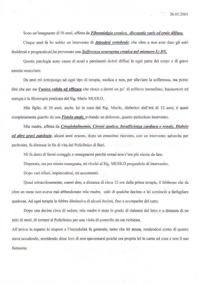 Mio fratello qualche tempo prima aveva accompagnato la moglie dal Bioterapeuta Mario Muolo, perché aveva preso una brutta storta e nonostante non ci fossero rotture o fratture aveva dei problemi. Mi raccontava che il Sig. Mario Muolo riuscì a risolvere il suo problema. Mio marito, da tempo aveva problemi alla schiena cosi, entusiasta del risultato ottenuto da mia cognata, gli proposi di andare a trovare il Sig. Muolo. L'unico modo per convincerlo fu di andare insieme. Il Sig. Mario Muolo si a presentato subito come un serio professionista: - signori, io non sono Padre Pio, non faccio miracoli, se mi rendo conto che c'è qualcosa e io posso intervenire, allora intervengo, se non posso intervenire ve lo dico subito.