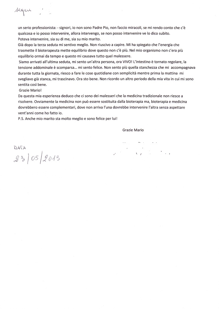 Già dopo la terza seduta mi sentivo meglio. Non riuscivo a capire. Mi ha spiegato che l'energia che trasmette il bioterapeuta mette equilibrio dove questo non c'e più. Nel mio organismo non c'era più equilibrio ormai da tempo e questo mi causava tutto quel malessere.