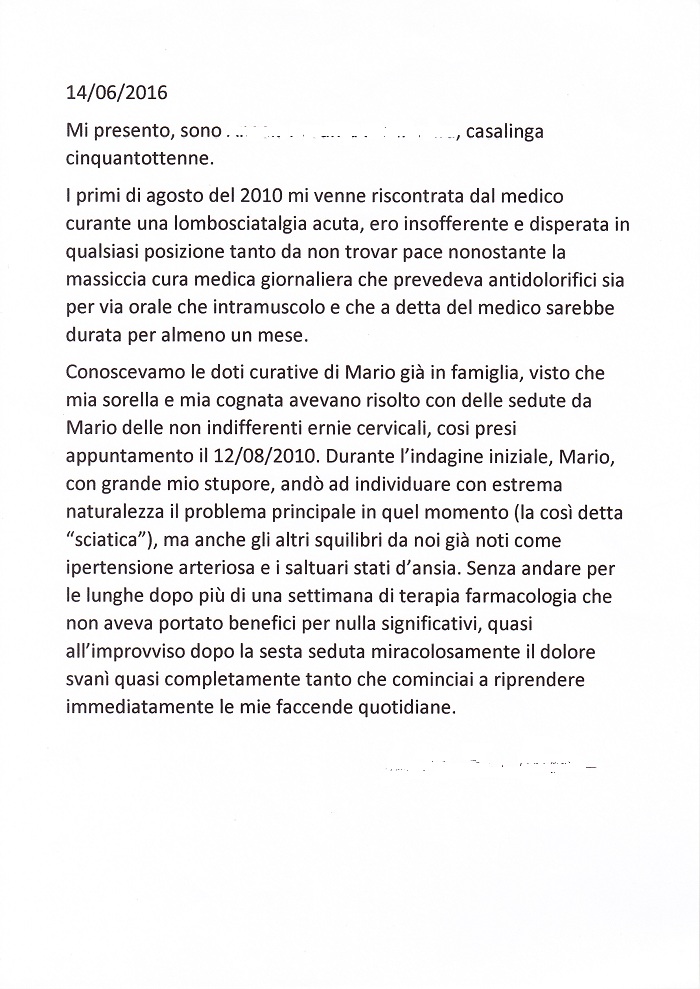 La Suora mi disse di aver provato, durante la prima seduta della cura, al contatto delle mani del bioterapeuta monopolitano, come uno sblocco, completo e felice, della sue energie fisiche e mentali. In precedenza ella avvertiva dolori reumatici in alcune zone del suo corpo. Solo con sforzo faticoso riusciva ad organizzare, con la coerenza e compattezza necessarie, i lavori che si proponeva. A cominciare dalle sedute terapeutiche, e in seguito per giorni e mesi ancora, la giovane artista ha avvertito uno spontaneo fluire di pensieri e di iniziative operative, la leggerezza di una concentrazione, quasi senza più fatica o stanchezza, senza più quella approssimazione di una volta.