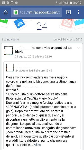 Le altre sedute hanno confermato questo mio fantastico risveglio. Il dolore del ginocchio destro è quasi scomparso. le altre parti dolenti hanno attenuato il loro influsso negativo. Quando leggo , in condizioni di luce ideali, l'analisi e la sintesi delle parole e delle frasi, il nesso logico, il ritmo narrativo dei particolari e dell'insieme, tutto si connette e si esplica naturalmente, con facilità e chiarezza. Ed anche con gioia. La nube minacciosa dell'Alzheimer o del morbo di Parkinson, posso dire, alla soglia dei miei novanta anni, che è scomparsa dall'orizzonte.