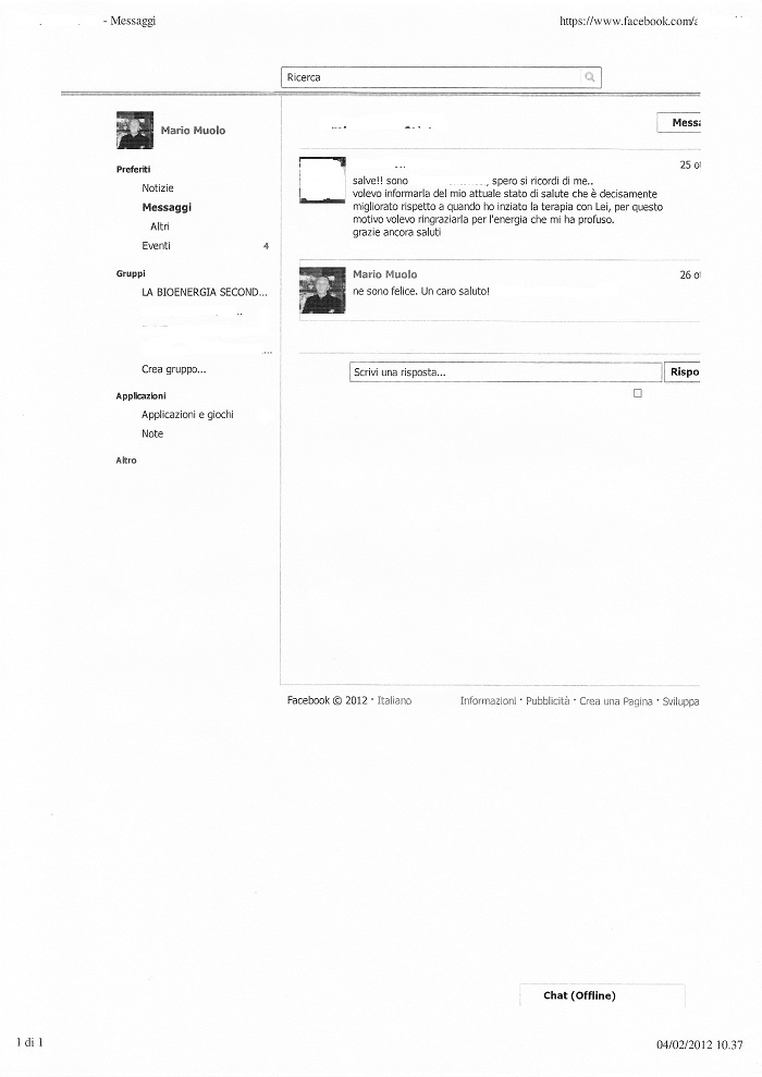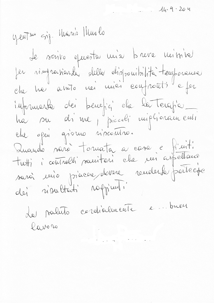… … 14-9-2011 Gent.mo Sig. Mario Muolo Le scrivo questa mia breve missiva per ringraziarla della disponibilità temporanea che ha avuto nei miei confronti e per informarla dei benefici che la terapia ha su di me, piccoli miglioramenti che ogni giorno riscontro. Quando sarò tornata a casa e finiti tutti i controlli sanitari che mi aspettano sarà mio piacere/dovere renderla partecipe dei risultati raggiunti. La saluto cordialmente e … buon lavoro … … Salve!!! Sono … … spero si ricordi di me … volevo informarla del mio attuale stato di salute che è decisamente migliorato rispetto a quando ho iniziato la terapia con Lei, per questo motivo volevo ringraziarla per l’energia che mi ha profuso. Grazie ancora saluti