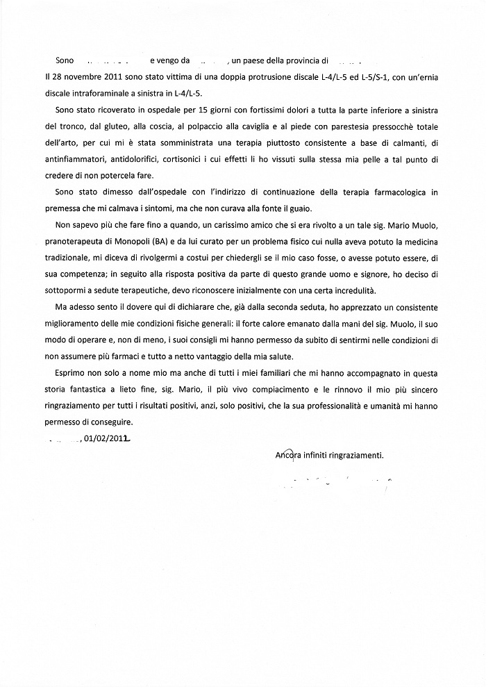 Sono .. ...e vengo da ... ... , un paese della provincia di ... ... . Il 28 novembre 2011 sono stato vittima di una doppia protrusione discale L-4/L-5 ed L-5/S-1, con un'ernia discale intraforaminale a sinistra in L-4/L-5. Sono stato ricoverato in ospedale per 15 giorni con fortissimi dolori a tutta la parte inferiore a sinistra del tronco, dal gluteo, alla coscia, al polpaccio alla caviglia e al piede con parestesia pressocchè totale dell'arto, per cui mi è stata somministrata una terapia piuttosto consistente a base di calmanti, di antinfiammatori, antidolorifici, cortisonici i cui effetti li ho vissuti sulla stessa mia pelle a tal punto di credere di non potercela fare. Sono stato dimesso dall'ospedale con l'indirizzo di continuazione della terapia farmacologica in premessa che mi calmava i sintomi, ma che non curava alla fonte il guaio. Non sapevo più che fare fino a quando, un carissimo amico che sì era rivolto a un tale sig. Mario Muolo, pranoterapeuta di Monopoli (BA) e da lui curato per un problema fisico cui nulla aveva potuto la medicina tradizionale, mi diceva di rivolgermi a costui per chiedergli se il mio caso fosse, o avesse potuto essere, di sua competenza; in seguito alla risposta positiva da parte di questo grande uomo e signore, ho deciso di sottopormi a sedute terapeutiche, devo riconoscere inizialmente con una certa incredulità. Ma adesso sento il dovere qui di dichiarare che, già dalla seconda seduta, ho apprezzato un consistente miglioramento delle mie condizioni fisiche generali: il forte calore emanato dalla mani del sig. Muolo, il suo modo di operare e, non di meno, i suoi consigli mi hanno permesso da subito di sentirmi nelle condizioni di non assumere più farmaci e tutto a netto vantaggio della mia salute. Esprimo non solo a nome mio ma anche di tutti i miei familiari che mi hanno accompagnato in questa storia fantastica a lieto fine, sig. Mario, il più vivo compiacimento e le rinnovo il mio più sincero ringraziamento per tutti i risultati positivi, anzi, solo positivi, che la sua professionalità e umanità mi hanno permesso di conseguire. ... .., 01/02/2011. Ancora infiniti ringraziamenti. ... ...