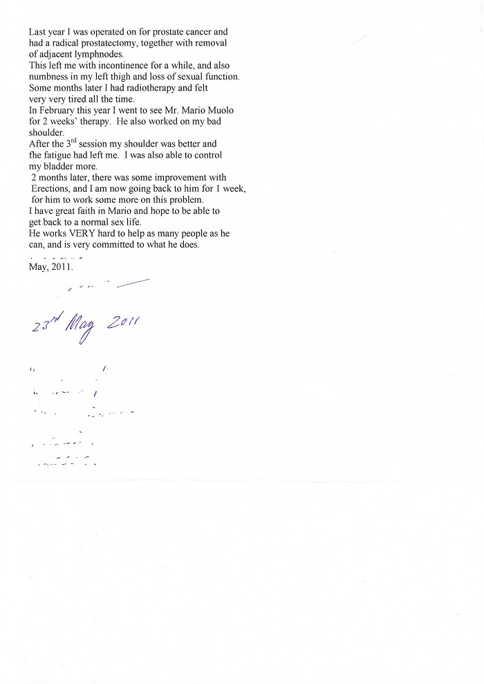 L'anno scorso sono stato operato di un cancro alla prostata ed ho avuto una prostatectomia radicale con rimozione dei linfonodi adiacenti. Questo mi ha lasciato con l’incontinenza per un bel po’ di tempo, ed anche intorpidimento alla coscia sinistra e perdita della funzione sessuale. Alcuni mesi dopo mi sono sottoposto a radioterapia e mi sentivo molto stanco tutto il tempo. Nel Febbraio di quest'anno mi sono recato dal Sig. Mario Muolo per una terapia di 2 settimane. Egli è intervenuto anche al mio malessere sulla mia spalla. Dopo la terza seduta la mia spalla andava meglio e non mi sentivo più stanco. Ero anche capace di controllare maggiormente la vescica. Dopo 2 mesi ho avuto un miglioramento nell'Erezione, ed ora ritornerò da lui per una settimana, perché intervenga ancora su questo problema. Ho grande fiducia in Mario e spero di essere in grado di tornare ad una normale vita sessuale. Egli si impegna veramente tanto per aiutare quante più persone può, e lo fa con dedizione. ... ... 23 Mag. 2011