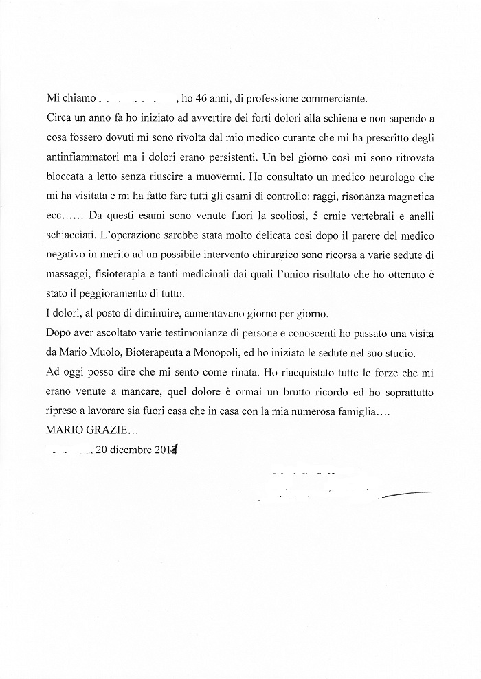 Mi chiamo ... ... , ho 46 anni, di professione commerciante. Circa un anno fa ho iniziato ad avvertire dei forti dolori alla schiena e non sapendo a cosa fossero dovuti mi sono rivolta dal mio medico curante che mi ha prescritto degli antinfiammatori ma i dolori erano persistenti. Un bel giorno così mi sono ritrovata bloccata a letto senza riuscire a muovermi. Ho consultato un medico neurologo che mi ha visitata e mi ha fatto fare tutti gli esami di controllo: raggi, risonanza magnetica ecc Da questi esami sono venute fuori la scoliosi, 5 ernie vertebrali e anelli schiacciati. L'operazione sarebbe stata molto delicata così dopo il parere del medico negativo in merito ad un possibile intervento chirurgico sono ricorsa a varie sedute di massaggi, fisioterapia e tanti medicinali dai quali l'unico risultato che ho ottenuto è stato il peggioramento di tutto. I dolori, al posto di diminuire, aumentavano giorno per giorno. Dopo aver ascoltato varie testimonianze di persone e conoscenti ho passato una visita da Mario Muolo, Bioterapeuta a Monopoli, ed ho iniziato le sedute nel suo studio. Ad oggi posso dire che mi sento come rinata. Ho riacquistato tutte le forze che mi erano venute a mancare, quel dolore è ormai un brutto ricordo ed ho soprattutto ripreso a lavorare sia fuori casa che in casa con la mia numerosa famiglia.... MARIO GRAZIE... ... ..., 20 dicembre 2011 ... ...