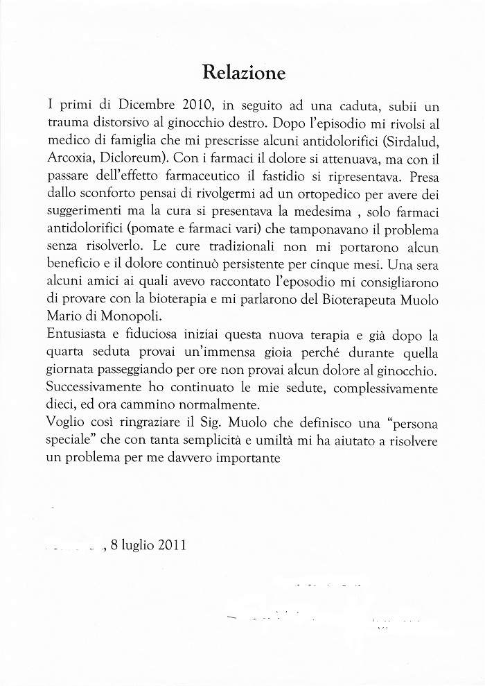 Relazione I primi di Dicembre 2010, in seguito ad una caduta, subii un trauma distorsivo al ginocchio destro. Dopo l'episodio mi rivolsi al medico di famiglia che mi prescrisse alcuni antidolorifici (Sirdalud, Arcoxia, Dicloreum). Con i farmaci il dolore si attenuava, ma con il passare dell'effetto farmaceutico il fastidio si ripresentava. Presa dallo sconforto pensai di rivolgermi ad un ortopedico per avere dei suggerimenti ma la cura si presentava la medesima , solo farmaci antidolorifici (pomate e farmaci vari) che tamponavano il problema senza risolverlo. Le cure tradizionali non mi portarono alcun beneficio e il dolore continuò persistente per cinque mesi. Una sera alcuni amici ai quali avevo raccontato l'eposodio mi consigliarono di provare con la bioterapia e mi parlarono del Bioterapeuta Muoio Mario di Monopoli. Entusiasta e fiduciosa iniziai questa nuova terapia e già dopo la quarta seduta provai un'immensa gioia perché durante quella giornata passeggiando per ore non provai alcun dolore al ginocchio. Successivamente ho continuato le mie sedute, complessivamente dieci, ed ora cammino normalmente. Voglio così ringraziare il Sig. Muolo che definisco una "persona speciale" che con tanta semplicità e umiltà mi ha aiutato a risolvere un problema per me davvero importante. ... ... , 8 luglio 2011
