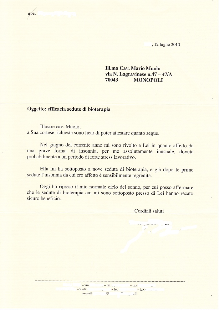 avv. ... ... ..., 12 luglio 2010 Ill.mo Cav. Mario Muolo via N. Lagravinese n.47 — 47/A 70043 MONOPOLI Oggetto: efficacia sedute di bioterapia Illustre cav. Muolo, a Sua cortese richiesta sono lieto di poter attestare quanto segue. Nel giugno del corrente anno mi sono rivolto a Lei in quanto affetto da una grave forma di insonnia, per me assolutamente inusuale, dovuta probabilmente a un periodo di forte stress lavorativo. Ella mi ha sottoposto a nove sedute di bioterapia, e già dopo le prime sedute l'insonnia da cui ero affetto è sensibilmente regredita. Oggi ho ripreso il mio normale ciclo del sonno, per cui posso affermare che le sedute di bioterapia cui mi sono sottoposto presso di Lei hanno recato sicuro beneficio. Cordiali saluti ... ...