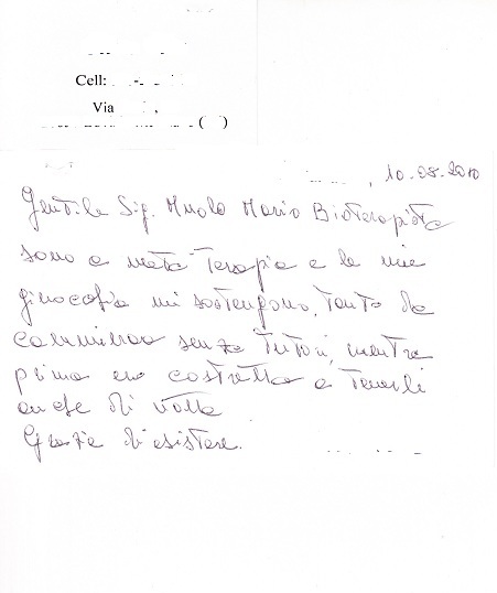 … … …. Cell. … .. Via… … … … …. 10.08.2010 Gentile Sig. Muolo Mario Bioterapista sono a metà terapia e le mie ginocchia mi sostengono, tanto da camminare senza tutori, mentre prima ero costretta a tenerli anche di notte. Grazie di esistere. … …