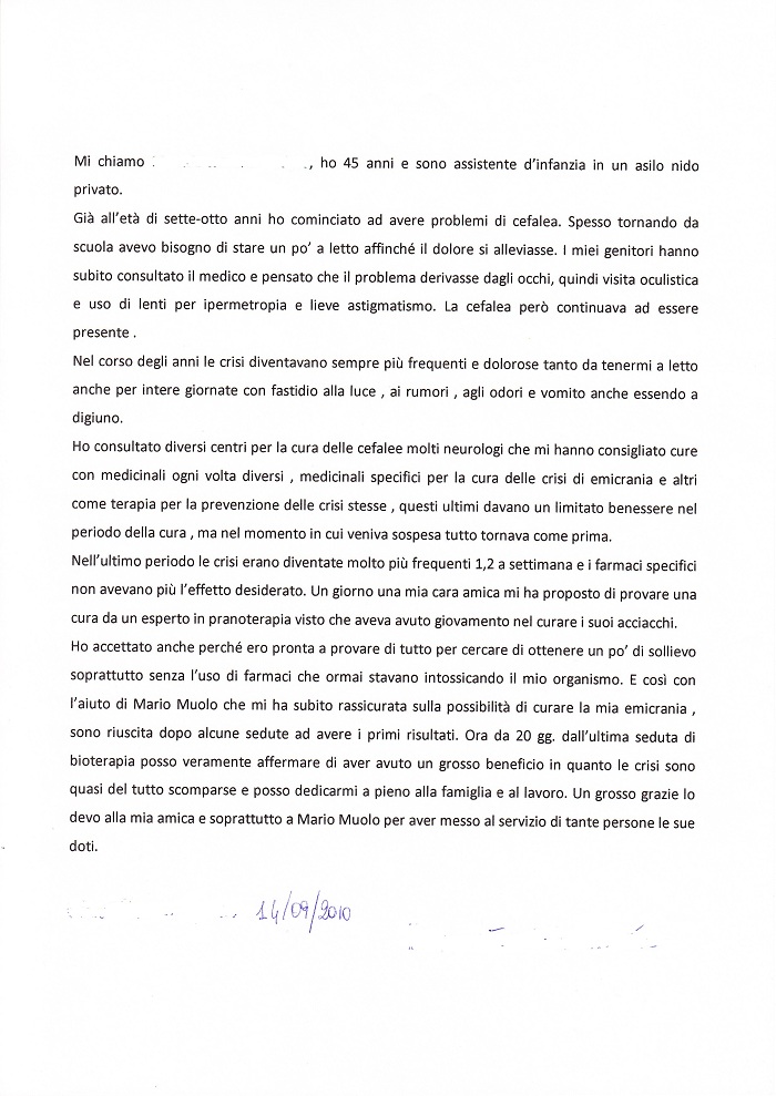 Mi chiamo ... ... , ho 45 anni e sono assistente d'infanzia in un asilo nido privato. Già all'età di sette-otto anni ho cominciato ad avere problemi di cefalea. Spesso tornando da scuola avevo bisogno di stare un po' a letto affinché il dolore si alleviasse. I miei genitori hanno subito consultato il medico e pensato che il problema derivasse dagli occhi, quindi visita oculistica e uso di lenti per ipermetropia e lieve astigmatismo. La cefalea però continuava ad essere presente . Nel corso degli anni le crisi diventavano sempre più frequenti e dolorose tanto da tenermi a letto anche per intere giornate con fastidio alla luce , ai rumori , agli odori e vomito anche essendo a digiuno. Ho consultato diversi centri per la cura delle cefalee molti neurologi che mi hanno consigliato cure con medicinali ogni volta diversi , medicinali specifici per la cura delle crisi di emicrania e altri come terapia per la prevenzione delle crisi stesse , questi ultimi davano un limitato benessere nel periodo della cura , ma nel momento in cui veniva sospesa tutto tornava come prima. Nell'ultimo periodo le crisi erano diventate molto più frequenti 1,2 a settimana e i farmaci specifici non avevano più l'effetto desiderato. Un giorno una mia cara amica mi ha proposto di provare una cura da un esperto in pranoterapia visto che aveva avuto giovamento nel curare i suoi acciacchi. Ho accettato anche perché ero pronta a provare di tutto per cercare di ottenere un po' di sollievo soprattutto senza l'uso di farmaci che ormai stavano intossicando il mio organismo. E così con l'aiuto di Mario Muolo che mi ha subito rassicurata sulla possibilità di curare la mia emicrania , sono riuscita dopo alcune sedute ad avere i primi risultati. Ora da 20 gg. dall'ultima seduta di bioterapia posso veramente affermare di aver avuto un grosso beneficio in quanto le crisi sono quasi del tutto scomparse e posso dedicarmi a pieno alla famiglia e al lavoro. Un grosso grazie lo devo alla mia amica e soprattutto a Mario Muolo per aver messo al servizio di tante persone le sue doti. 14/09/2010 ... ... ...