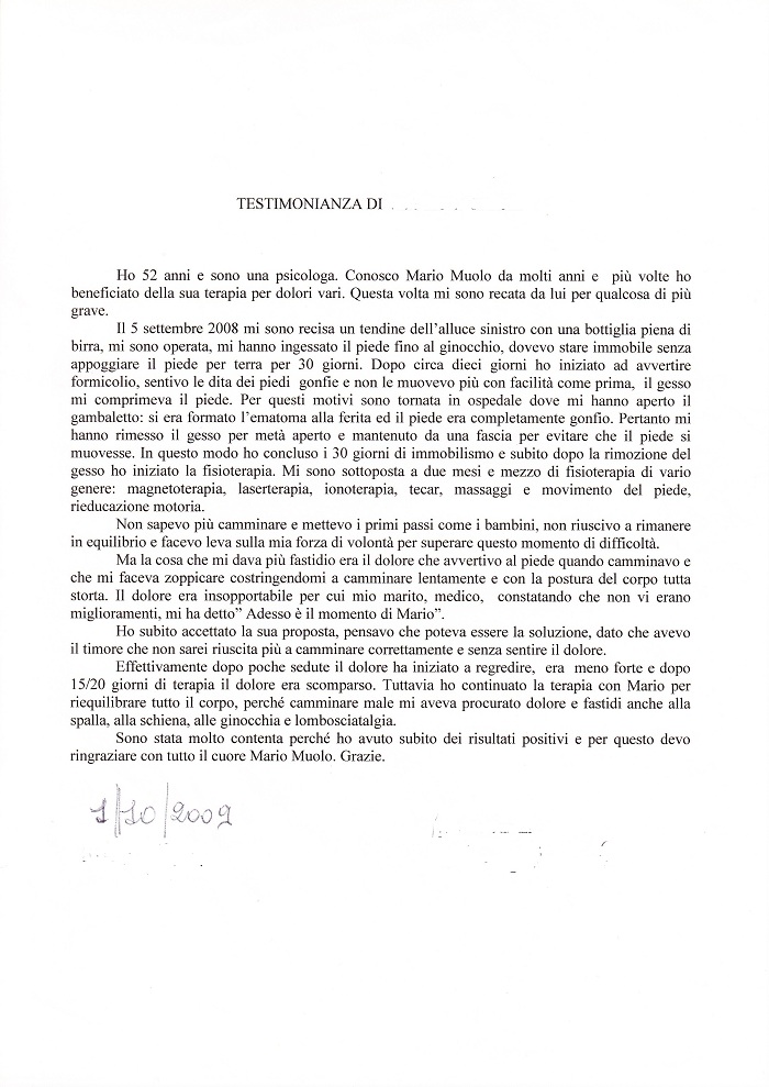 TESTIMONIANZA DI ... ... Ho 52 anni e sono una psicologa. Conosco Mario Muolo da molti anni e più volte ho beneficiato della sua terapia per dolori vari. Questa volta mi sono recata da lui per qualcosa di più grave. Il 5 settembre 2008 mi sono recisa un tendine dell'alluce sinistro con una bottiglia piena di birra, mi sono operata, mi hanno ingessato il piede fino al ginocchio, dovevo stare immobile senza appoggiare il piede per terra per 30 giorni. Dopo circa dieci giorni ho iniziato ad avvertire formicolio, sentivo le dita dei piedi gonfie e non le muovevo più con facilità come prima, il gesso mi comprimeva il piede. Per questi motivi sono tornata in ospedale dove mi hanno aperto il gambaletto: si era formato l'ematoma alla ferita ed il piede era completamente gonfio. Pertanto mi hanno rimesso il gesso per metà aperto e mantenuto da una fascia per evitare che il piede si muovesse. In questo modo ho concluso i 30 giorni di immobilismo e subito dopo la rimozione del gesso ho iniziato la fisioterapia. Mi sono sottoposta a due mesi e mezzo di fisioterapia di vario genere: magnetoterapia, laserterapia, ionoterapia, tecar, massaggi e movimento del piede, rieducazione motoria. Non sapevo più camminare e mettevo i primi passi come i bambini, non riuscivo a rimanere in equilibrio e facevo leva sulla mia forza di volontà per superare questo momento di difficoltà. Ma la cosa che mi dava più fastidio era il dolore che avvertivo al piede quando camminavo e che mi faceva zoppicare costringendomi a camminare lentamente e con la postura del corpo tutta storta. Il dolore era insopportabile per cui mio marito, medico, constatando che non vi erano miglioramenti, mi ha detto" Adesso è il momento di Mario". Ho subito accettato la sua proposta, pensavo che poteva essere la soluzione, dato che avevo il timore che non sarei riuscita più a camminare correttamente e senza sentire il dolore. Effettivamente dopo poche sedute il dolore ha iniziato a regredire, era meno forte e dopo 15/20 giorni di terapia il dolore era scomparso. Tuttavia ho continuato la terapia con Mario per riequilibrare tutto il corpo, perché camminare male mi aveva procurato dolore e fastidi anche alla spalla, alla schiena, alle ginocchia e lombosciatalgia. Sono stata molto contenta perché ho avuto subito dei risultati positivi e per questo devo ringraziare con tutto il cuore Mario Muolo. Grazie. 01-10-09 ... ...