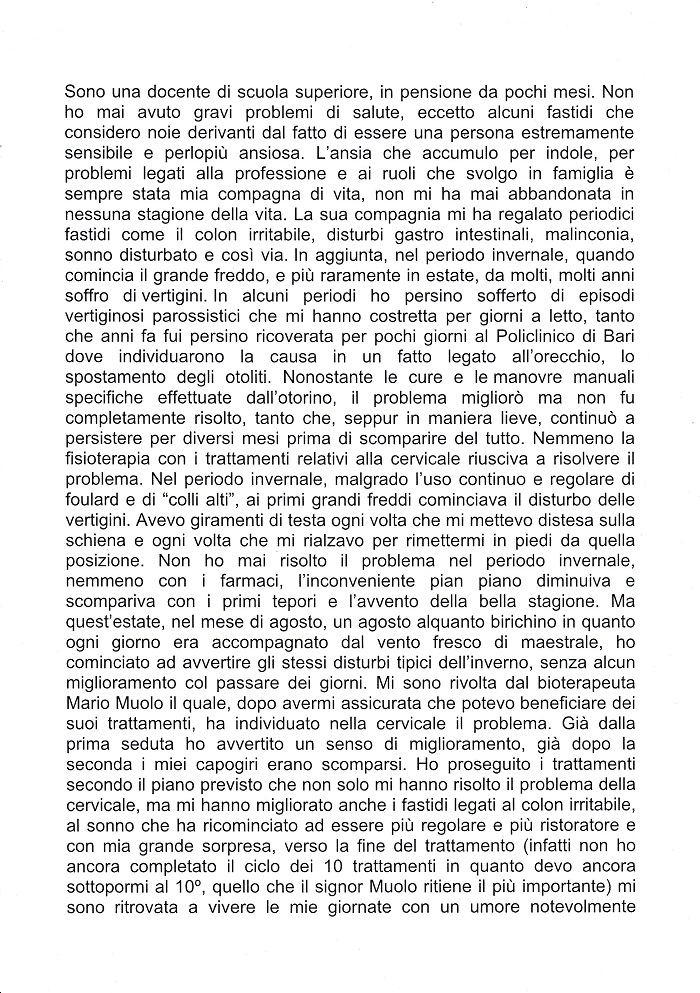 Sono una docente di scuola superiore, in pensione da pochi mesi. Non ho mai avuto gravi problemi di salute, eccetto alcuni fastidi che considero noie derivanti dal fatto di essere una persona estremamente sensibile e perlopiù ansiosa. L'ansia che accumulo per indole, per problemi legati alla professione e ai ruoli che svolgo in famiglia è sempre stata mia compagna di vita, non mi ha mai abbandonata in nessuna stagione della vita. La sua compagnia mi ha regalato periodici fastidi come il colon irritabile, disturbi gastro intestinali, malinconia, sonno disturbato e così via. In aggiunta, nel periodo invernale, quando comincia il grande freddo, e più raramente in estate, da molti, molti anni soffro di vertigini. In alcuni periodi ho persino sofferto di episodi vertiginosi parossistici che mi hanno costretta per giorni a letto, tanto che anni fa fui persino ricoverata per pochi giorni al Policlinico di Bari dove individuarono la causa in un fatto legato all'orecchio, lo spostamento degli otoliti. Nonostante le cure e le manovre manuali specifiche effettuate dall'otorino, il problema migliorò ma non fu completamente risolto, tanto che, seppur in maniera lieve, continuò a persistere per diversi mesi prima di scomparire del tutto. Nemmeno la fisioterapia con i trattamenti relativi alla cervicale riusciva a risolvere il problema. Nel periodo invernale, malgrado l'uso continuo e regolare di foulard e di "colli alti", ai primi grandi freddi cominciava il disturbo delle vertigini. Avevo giramenti di testa ogni volta che mi mettevo distesa sulla schiena e ogni volta che mi rialzavo per rimettermi in piedi da quella posizione. Non ho mai risolto il problema nel periodo invernale, nemmeno con i farmaci, l'inconveniente pian piano diminuiva e scompariva con i primi tepori e l'avvento della bella stagione. Ma quest'estate, nel mese di agosto, un agosto alquanto birichino in quanto ogni giorno era accompagnato dal vento fresco di maestrale, ho cominciato ad avvertire gli stessi disturbi tipici dell'inverno, senza alcun miglioramento col passare dei giorni. Mi sono rivolta dal bioterapeuta Mario Muolo il quale, dopo avermi assicurata che potevo beneficiare dei suoi trattamenti, ha individuato nella cervicale il problema. Già della prima seduta ho avvertito un senso di miglioramento, già dopo la seconda i miei capogiri erano scomparsi. Ho proseguito i trattamenti secondo il piano previsto che non solo mi hanno risolto il problema della cervicale, ma mi hanno migliorato anche i fastidi legati al colon irritabile, al sonno che ha ricominciato ad essere più regolare e più ristoratore e con mia grande sorpresa, verso la fine del trattamento (infatti non ho ancora completato il ciclo dei 10 trattamenti in quanto devo ancora sottopormi al 10°, quello che il signor Muolo ritiene il più importante) mi sono ritrovata a vivere le mie giornate con un umore notevolmente
