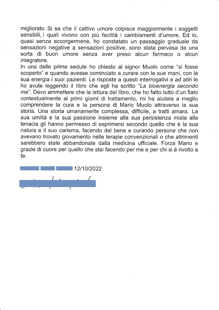 migliorato. Si sa che il cattivo umore colpisce maggiormente i soggetti sensibili, i quali vivono con più facilità i cambiamenti d'umore. Ed io, quasi senza accorgermene, ho constatato un passaggio graduate da sensazioni negative a sensazioni positive, sono stata pervasa da una sorta di buon umore senza aver preso alcun farmaco o alcun integratore. In una delle prime sedute ho chiesto al signor Muolo come "si fosse scoperto" e quando avesse cominciato a curare con le sue mani, con la sua energia i suoi pazienti. Le risposte a questi interrogativi e ad altri le ho avute leggendo il libro che egli ha scritto "La bioenergia secondo me". Devo ammettere che la lettura del libro, che ho fatto tutto d'un fiato contestualmente ai primi giorni di trattamento, mi ha aiutata a meglio comprendere la cura e la persona di Mario Muolo attraverso la sua storia. Una storia umanamente complessa, difficile, a tratti amara. La sua umiltà e la sua passione insieme alla sua persistenza mista alla tenacia gli hanno permesso di esprimersi secondo quello che è la sua natura e il suo carisma, facendo del bene e curando persone che non avevano trovato giovamento nelle terapie convenzionali o che altrimenti sarebbero state abbandonate dalla medicina ufficiale. Forza Mario e grazie di cuore per quello che stai facendo per me e per chi si è rivolto a te.