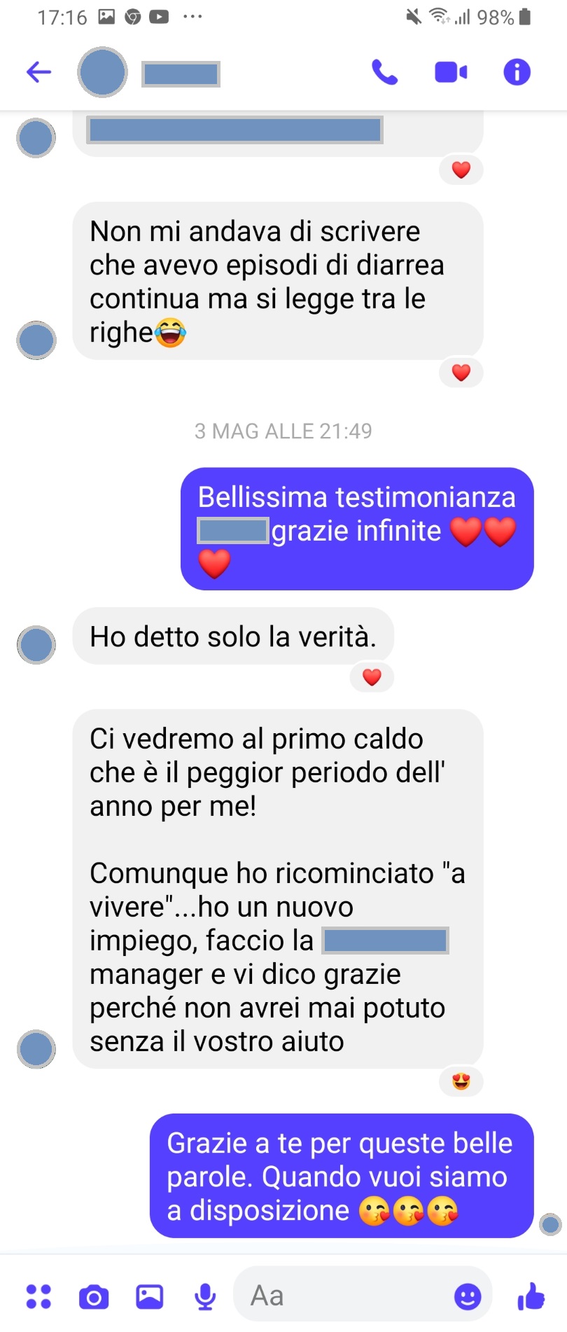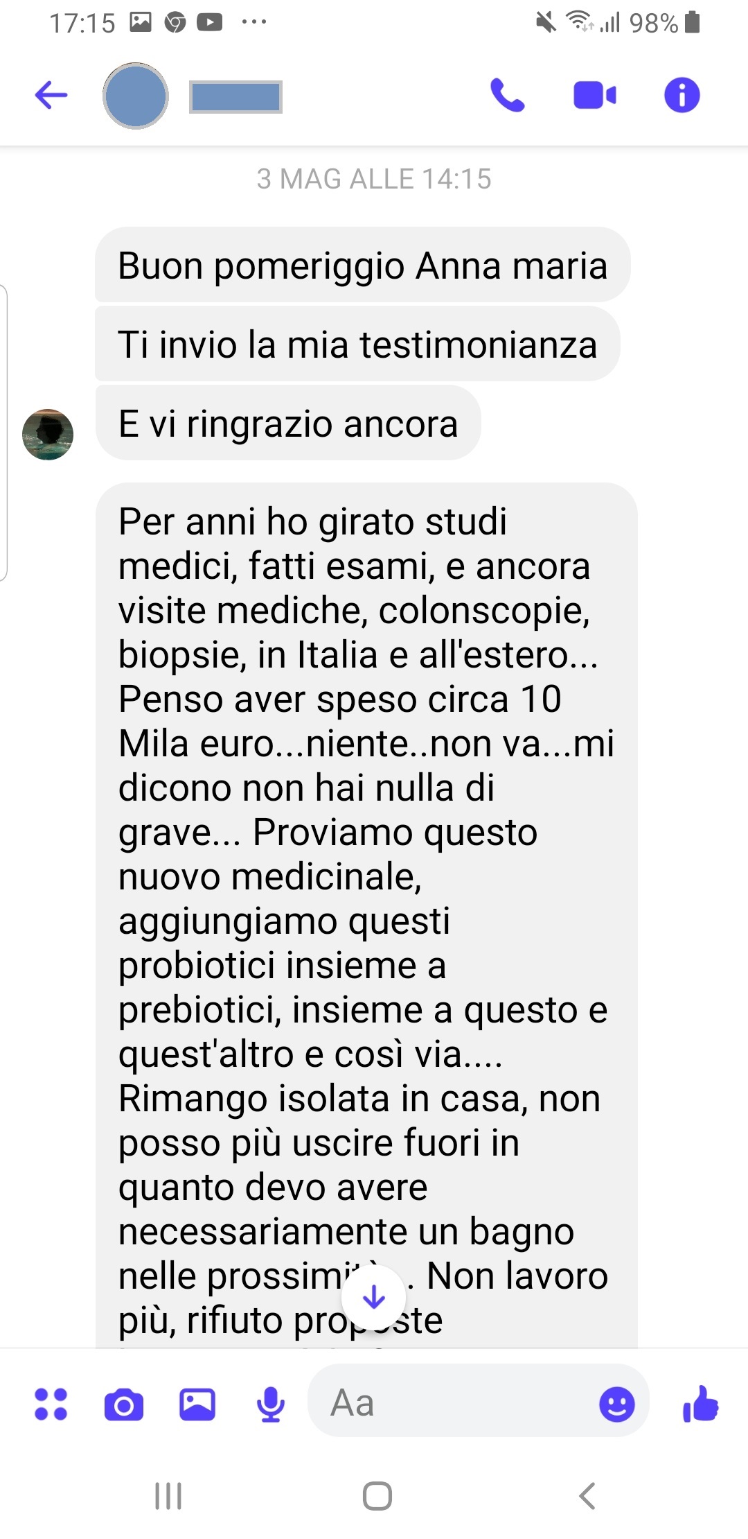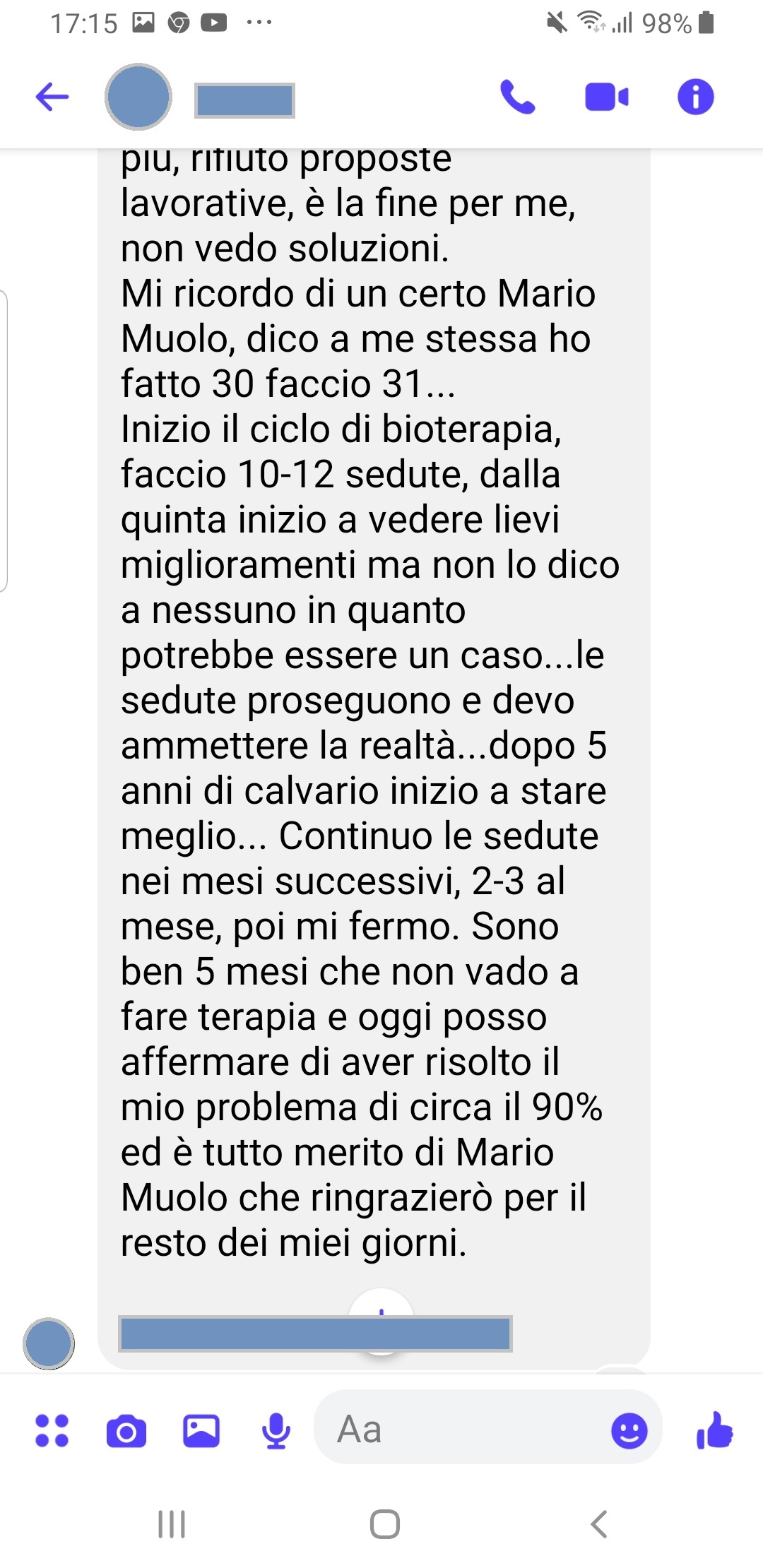 Per anni ho girato studi medici, fatti esami, e ancora visite mediche, colonscopie, biopsie, in Italia e all'estero... Penso aver speso circa 10 Mila euro...niente... non va...mi dicono non hai nulla di grave... Proviamo questo nuovo medicinale, aggiungiamo questi probiotici insieme a prebiotici, insieme a questo e quest'altro e così via.... Rimango isolata in casa, non posso più uscire fuori in quanto devo avere necessariamente un bagno nelle prossimità... Non lavoro più, rifiuto proposte lavorative, è la fine per me, non vedo soluzioni. Mi ricordo di un certo Mario Muolo, dico a me stessa ho fatto 30 faccio 31... Inizio il ciclo di bioterapia, faccio 10-12 sedute, dalla quinta inizio a vedere lievi miglioramenti ma non lo dico a nessuno in quanto potrebbe essere un caso... le sedute proseguono e devo ammettere la realtà...dopo 5 anni di calvario inizio a stare meglio... Continuo le sedute nei mesi successivi, 2-3 al mese, poi mi fermo. Sono ben 5 mesi che non vado a fare terapia e oggi posso affermare di aver risolto il mio problema di circa il 90% ed è tutto merito di Mario Muolo che ringrazierò per il resto dei miei giorni.