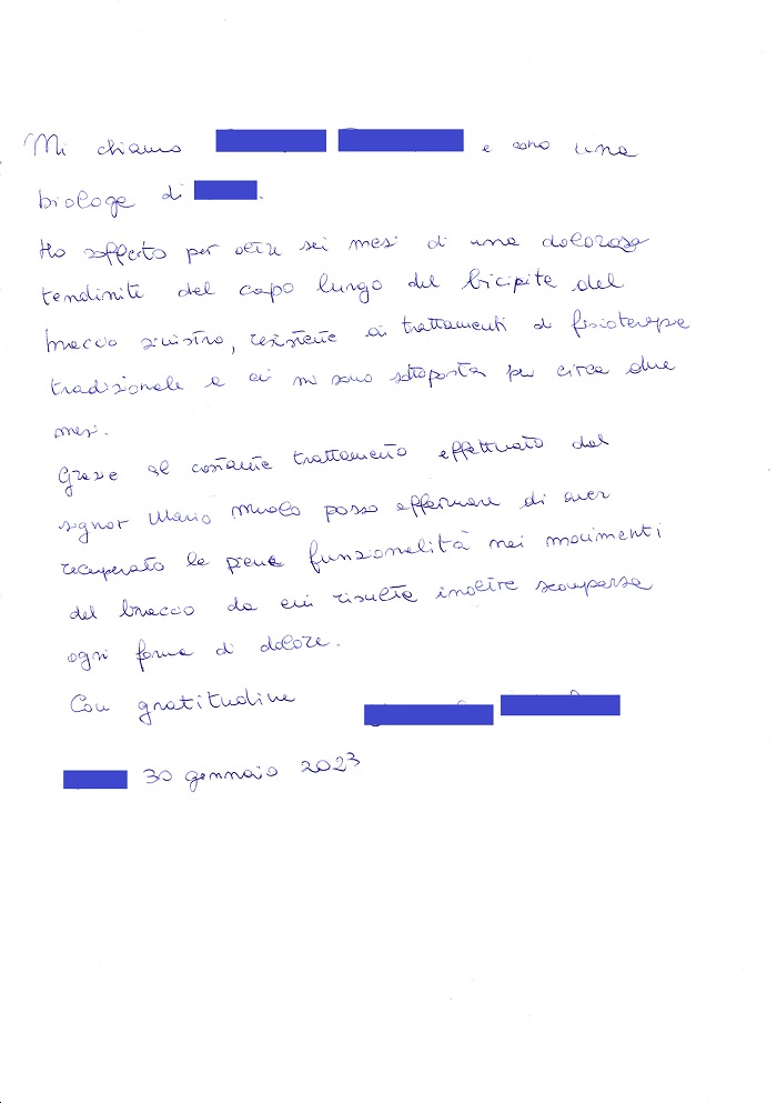 Ho sofferto per oltre sei mesi di una dolorosa tendinite del capo lungo del bicipite del braccio sinistro, resistente ai trattamenti di fisioterapia tradizionale a cui mi sono sottoposta per circa due mesi.
