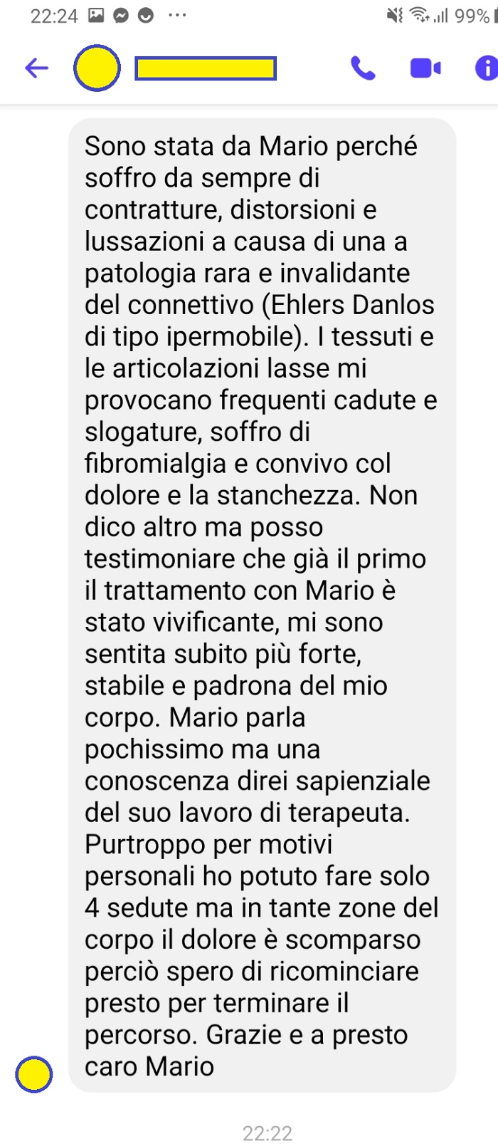 Sono stata da Mario perché soffro da sempre di contratture, distorsioni e lussazioni a causa di una patologia rara e invalidante del connettivo (Ehlers Danlos di tipo ipermobile). I tessuti e le articolazioni lasse mi provocano frequenti cadute e slogature, soffro di fibromialgia e convivo col dolore e la stanchezza. Non dico altro ma posso testimoniare che già il primo trattamento con Mario è stato vivificante, mi sono sentita subito più forte, stabile e padrona del mio corpo. Mario parla pochissimo ma ha una conoscenza direi sapienziale del suo lavoro di terapeuta. Purtroppo per motivi personali ho potuto fare solo 4 sedute ma in tante zone del corpo il dolore è scomparso perciò spero di ricominciare presto per terminare il percorso. Grazie e a presto caro Mario