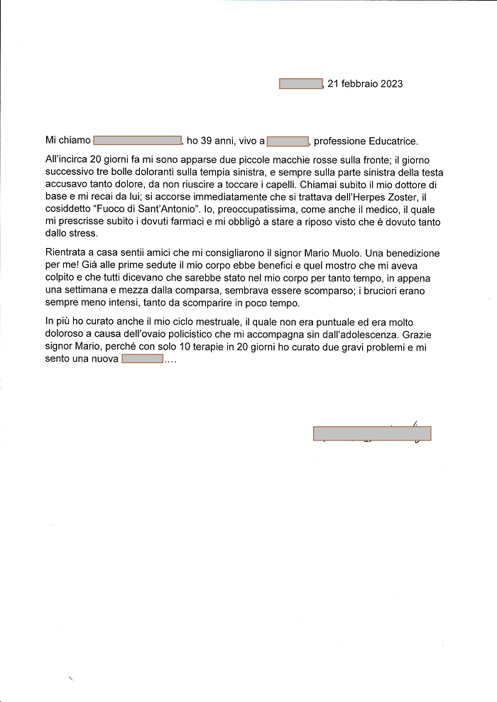 Rientrata a casa sentii amici che mi consigliarono il signor Mario Muolo. Una benedizione per me! Già alle prime sedute il mio corpo ebbe benefici e quel mostro che mi aveva colpito e che tutti dicevano che sarebbe stato nel mio corpo per tanto tempo, in appena una settimana e mezza dalla comparsa, sembrava essere scomparso; i bruciori erano sempre meno intensi, tanto da scomparire in poco tempo.