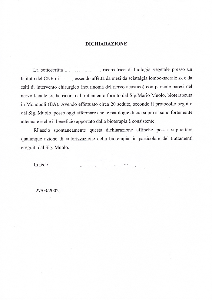 DICHIARAZIONE La sottoscritta ... ..., ricercatrice di biologia vegetale presso un Istituto del CNR di ... ..., essendo affetta da mesi da sciatalgia lombo-sacrale sx e da esiti di intervento chirurgico (neurinoma del nervo acustico) con parziale paresi del nervo faciale sx, ha ricorso al trattamento fornito dal Sig.Mario Muolo, bioterapeuta in Monopoli (BA). Avendo effettuato circa 20 sedute, secondo il protocollo seguito dal Sig. Muolo, posso oggi affermare che le patologie di cui sopra si sono fortemente attenuate e che il beneficio apportato dalla bioterapia è consistente. Rilascio spontaneamente questa dichiarazione affinchè possa supportare qualunque azione di valorizzazione della bioterapia, in particolare dei trattamenti eseguiti dal Sig. Muolo. In fede ... ... ... ..., 27/03/2002