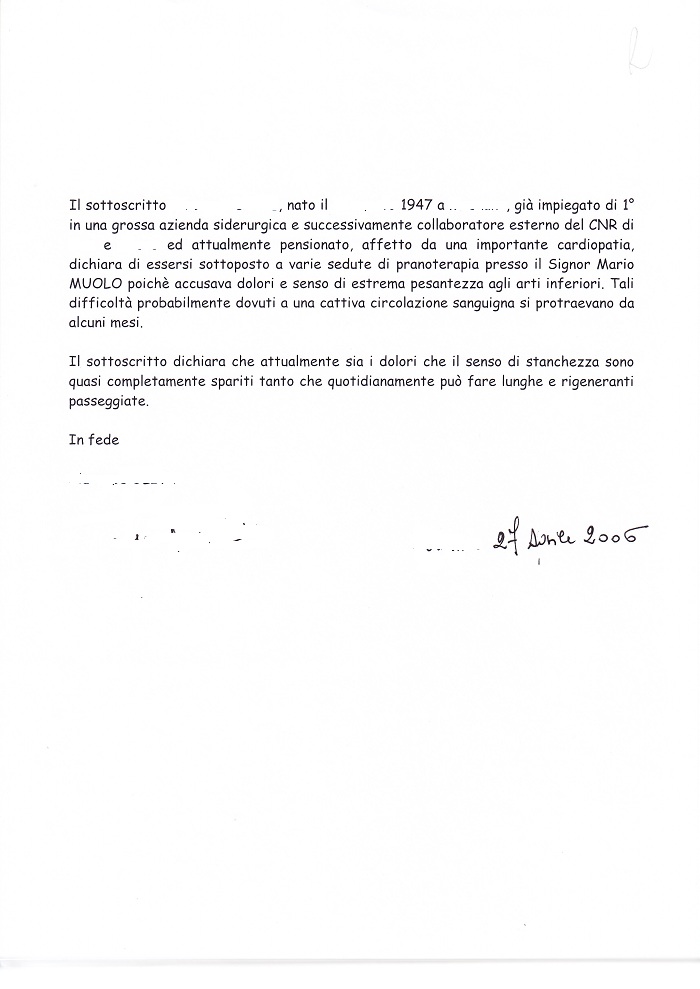 Il sottoscritto ... ... , nato il ... ... 1947 a ... ... , già impiegato di 1° in una grossa azienda siderurgica e successivamente collaboratore esterno del CNR di ... e ... ed attualmente pensionato, affetto da una importante cardiopatia, dichiara di essersi sottoposto a varie sedute di pranoterapia presso il Signor Mario MUOLO poichè accusava dolori e senso di estrema pesantezza agli arti inferiori. Tali difficoltà probabilmente dovuti a una cattiva circolazione sanguigna si protraevano da alcuni mesi. Il sottoscritto dichiara che attualmente sia i dolori che il senso di stanchezza sono quasi completamente spariti tanto che quotidianamente può fare lunghe e rigeneranti passeggiate. In fede ... ...