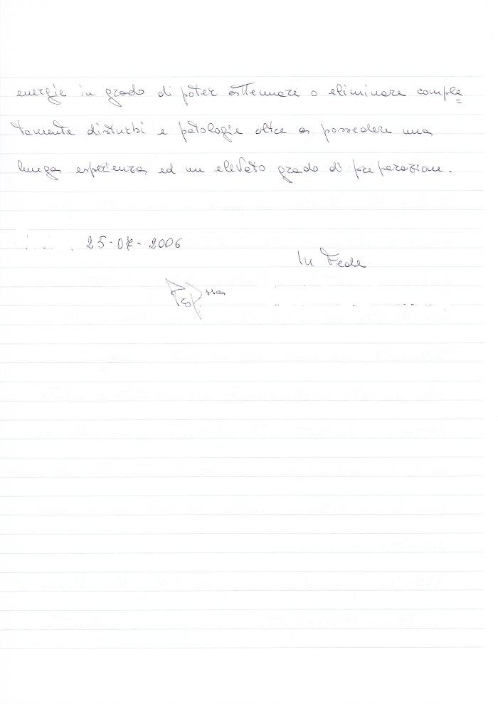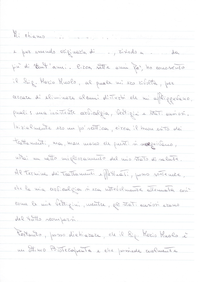 Mi chiamo … … e pur essendo originaria di … risiedo a … da più di vent’anni. Circa sette anni fa, ho conosciuto il Sig. Mario Muolo, al quale mi ero rivolta, per cercare di eliminare alcuni disturbi che mi affliggevano, quali: una insistente cervicalgia, vertigini e stati ansiosi. Inizialmente ero un po’ scettica, circa il buon esito dei trattamenti, ma, man mano che questi si seguitavano, notai un netto miglioramento del mio stato di salute. Al termine dei trattamenti effettuati, posso sostenere, che la mia cervicalgia si era notevolmente attenuata così come le vertigini, mentre, gli stati ansiosi erano del tutto scomparsi. Pertanto, posso dichiarare, che il Sig. Mario Muolo è un ottimo Bioterapeuta e che possiede realmente Energie in grado di poter attenuare o eliminare completamente disturbi e patologie oltre a possedere una lunga esperienza ed un elevato grado di preparazione. … … 25-07-2006 In fede Prof.ssa … …
