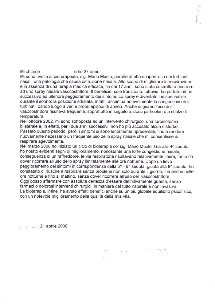 Mi chiamo ... ... e ho 27 anni. Mi sono rivolta al bioterapeuta, sig. Mario Muolo, perché affetta da ipertrofia dei turbinati nasali, una patologia che causa ostruzione nasale. Allo scopo di migliorare la respirazione e in assenza di una terapia medica efficace, fin dai 17 anni, sono stata costretta a ricorrere ad uno spray nasale vasocostrittore. Il beneficio, solo transitorio, tuttavia, ha portato ad un successivo ed ulteriore peggioramento dei sintomi. Lo spray é diventato indispensabile durante il sonno: la posizione sdraiata, infatti, accentua notevolmente la congestione dei turbinati, dando luogo a veri e propri episodi di apnea. Anche di giorno l'uso del vasocostrittore risultava frequente, soprattutto in seguito a sforzi particolari o a sbalzi di temperatura. Nell'ottobre 2002, mi sono sottoposta ad un intervento chirurgico, una turbinotomia bilaterale e, in effetti, per i due anni successivi, non ho più accusato alcun disturbo. Passato questo periodo, però, i sintomi si sono lentamente ripresentati, fino a rendere nuovamente necessario un frequente uso dello spray nasale che mí consentisse di respirare agevolmente. Nel marzo 2006 ho iniziato un ciclo di bioterapia col sig. Mario Muolo. Già alla 4" seduta, ho notato evidenti segni di miglioramento: nonostante una forte congestione nasale, conseguenza di un raffreddore, le vie respiratorie risultavano relativamente libere, tanto da dover ricorrere all'uso dello spray limitatamente alle ore notturne. Dopo un lieve peggioramento dei sintomi in corrispondenza della 5" - 6" seduta, giunta alla 8" seduta, ho constatato di riuscire a respirare senza problemi non solo durante il giorno, ma anche nelle ore notturne e fino al mattino, senza dover ricorrere all'uso del vasocostrittore. Oggi posso affermare con assoluta certezza d'essere definitivamente guarita, senza farmaci o dolorosi interventi chirurgici, in maniera del tutto naturale e non invasiva. La bioterapia, infine, ha avuto effetti benefici anche su un più globale equilibrio psicofisico, con un notevole miglioramento della qualità della mia vita. ... ..., 21 aprile 2006... ...
