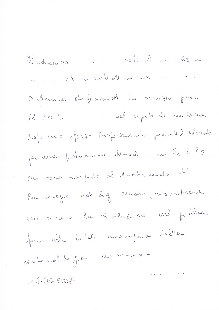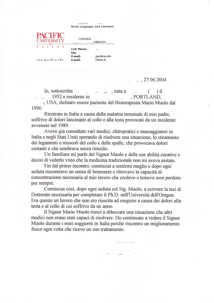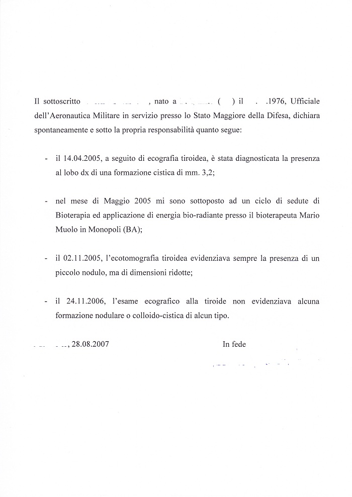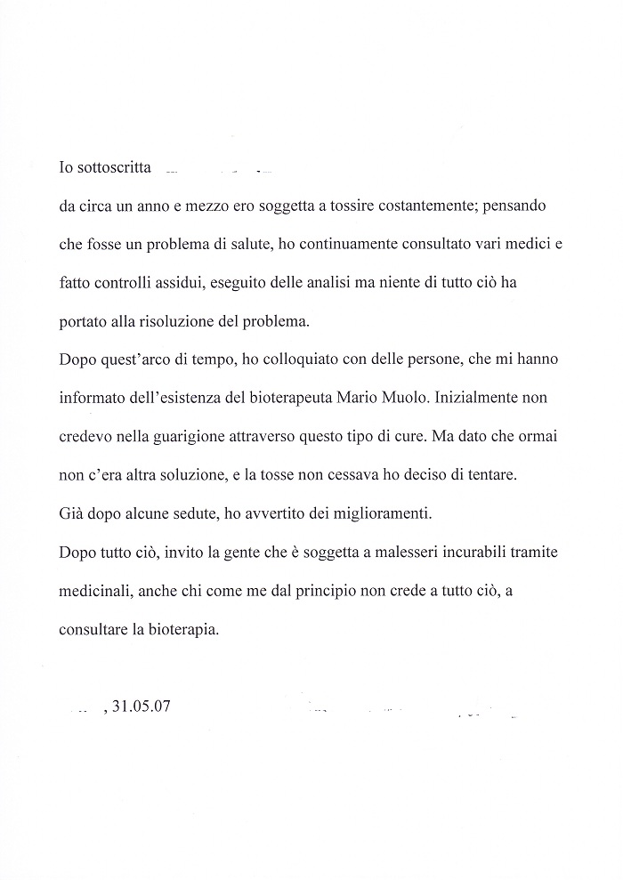 Dopo quest'arco di tempo, ho colloquiato con delle persone, che mi hanno informato dell'esistenza del bioterapeuta Mario Muolo. Inizialmente non credevo nella guarigione attraverso questo tipo di cure. Ma dato che ormai non c'era altra soluzione, e la tosse non cessava ho deciso di tentare. Già dopo alcune sedute, ho avvertito dei miglioramenti.
