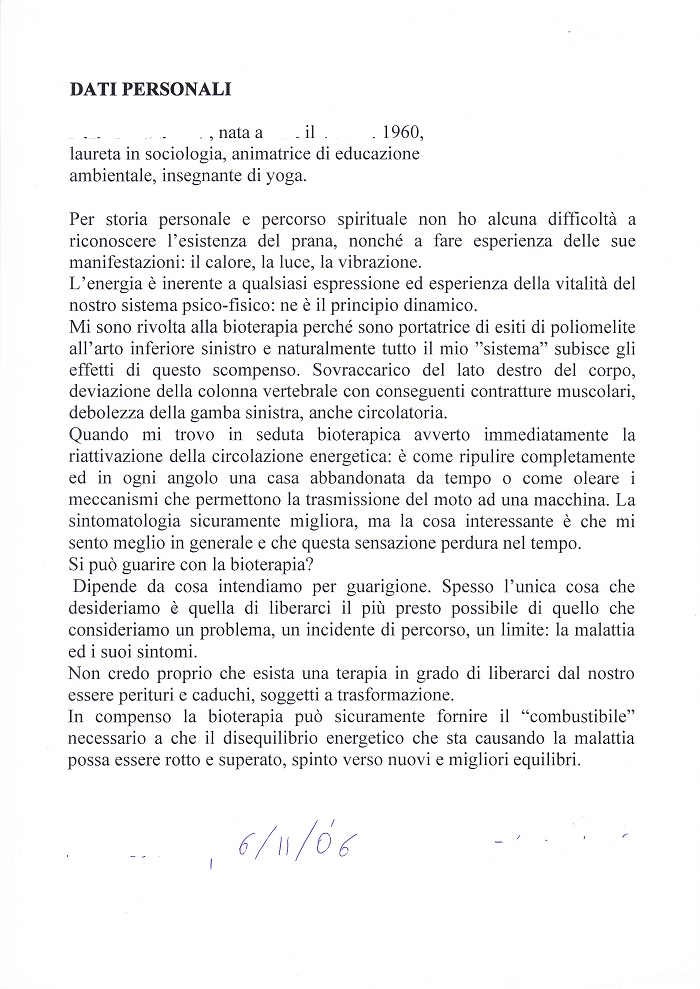 Dopo tutto ciò, invito la gente che è soggetta a malesseri incurabili tramite medicinali, anche chi come me dal principio non crede a tutto ciò, a consultare la bioterapia.