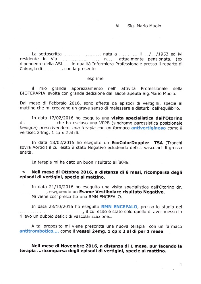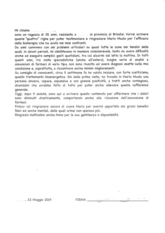 Mi chiamo ... ... ..., sono un ragazzo di 25 anni, residente a ... ... in provincia di Brindisi. Vorrei scrivere queste "quattro" righe per poter testimoniare e ringraziare Mario Muolo per l'efficacia della bioterapia che ha avuto nei miei confronti.