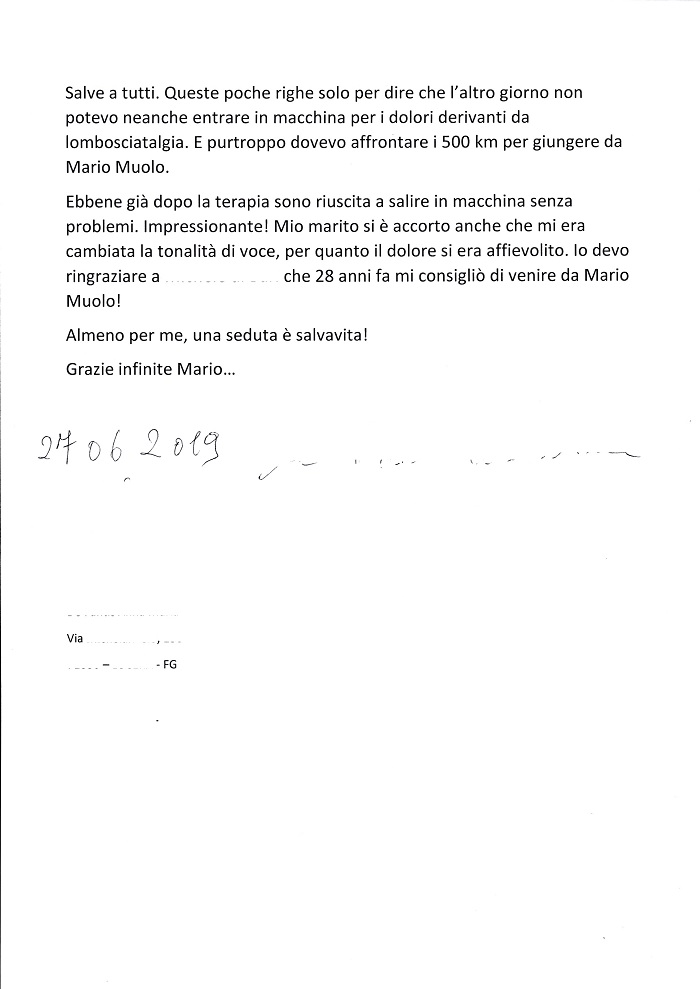 Ebbene già dopo la terapia sono riuscita a salire in macchina senza problemi. Impressionante! Mio marito si è accorto anche che mi era cambiata la tonalità di voce, per quanto il dolore si era affievolito. Io devo ringraziare a ... ... ... che 28 anni fa mi consigliò di venire da Mario Muolo!