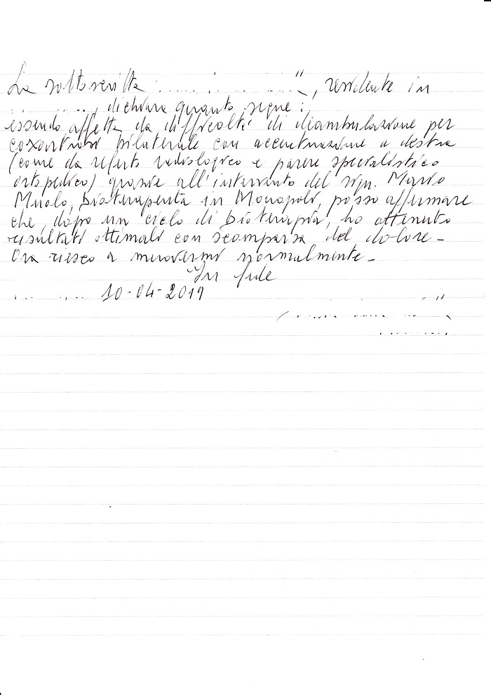 essendo affetta da difficoltà di deambulazione per coxartrosi bilaterale con accentuazione a destra (come da referto radiologico e parere specialistico ortopedico) grazie all’intervento del Sign. Mario Muolo, bioterapeuta in Monopoli, posso affermare che, dopo un ciclo di bioterapia, ho ottenuto risultati ottimali con scomparsa del dolore.