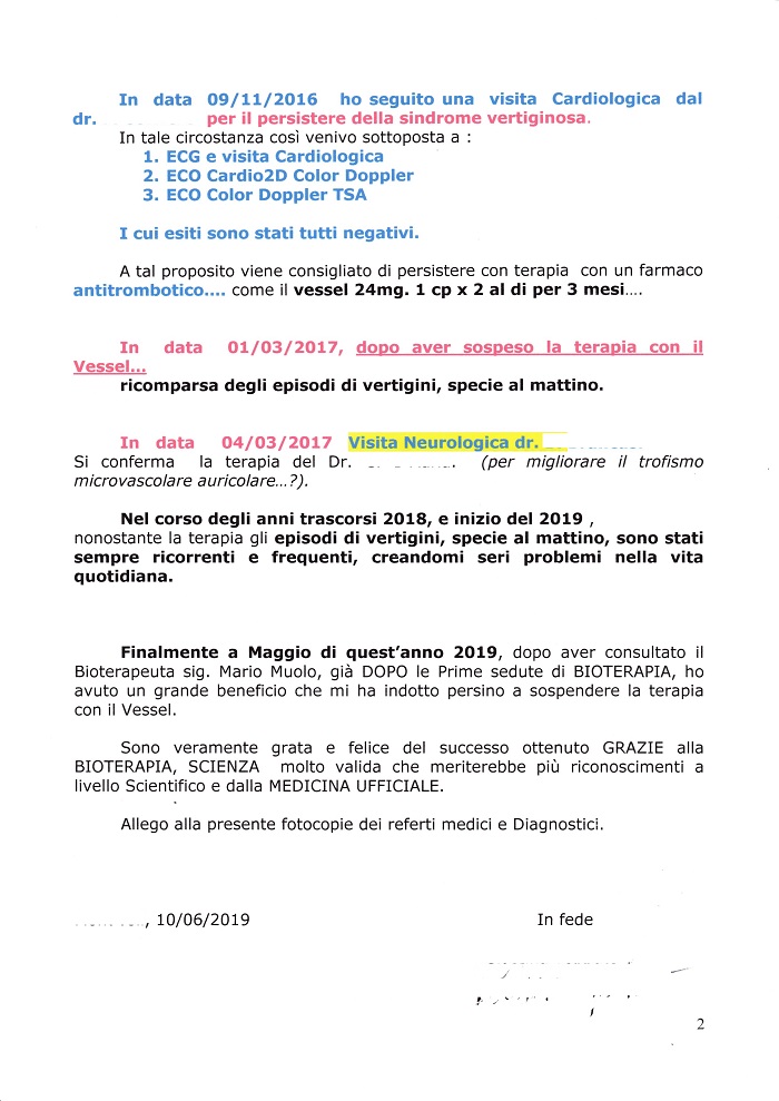 Finalmente a Maggio di quest'anno 2019, dopo aver consultato il Bioterapeuta sig. Mario Muolo, gia DOPO le Prime sedute di BIOTERAPIA, ho avuto un grande beneficio che mi ha indotto persino a sospendere la terapia con il Vessel.