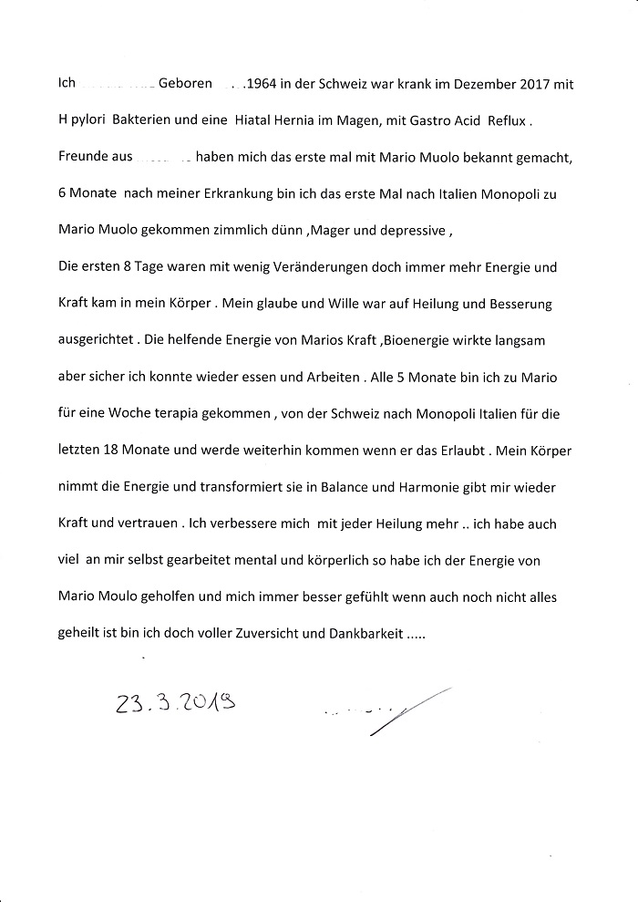 Die ersten 8 Tage waren mit wenig Veränderungen doch immer mehr Energie und Kraft kam in mein Körper . Mein glaube und Wille war auf Heilung und Besserung ausgerichtet . Die helfende Energie von Marios Kraft ,Bioenergie wirkte langsam aber sicher ich konnte wieder essen und Arbeiten . Alle 5 Monate bin ich zu Mario für eine Woche terapia gekommen , von der Schweiz nach Monopoli Italien für die letzten 18 Monate und werde weiterhin kommen wenn er das Erlaubt . Mein Körper nimmt die Energie und transformiert sie in Balance und Harmonie gibt mir wieder Kraft und vertrauen . Ich verbessere mich  mit jeder Heilung mehr .. ich habe auch viel  an mir selbst gearbeitet mental und körperlich so habe ich der Energie von Mario Moulo geholfen und mich immer besser gefühlt wenn auch noch nicht alles geheilt ist bin ich doch voller Zuversicht und Dankbarkeit .....
