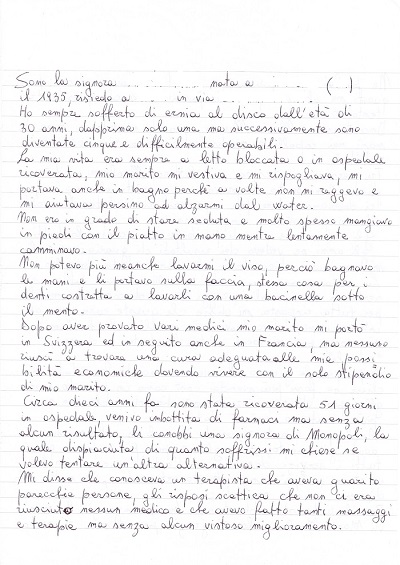 Mi disse che conosceva un terapista che aveva guarito parecchie persone, gli risposi scettica che non ci era riuscito nessun medico e che avevo fatto tanti massaggi e terapie ma senza alcun vistoso miglioramento.