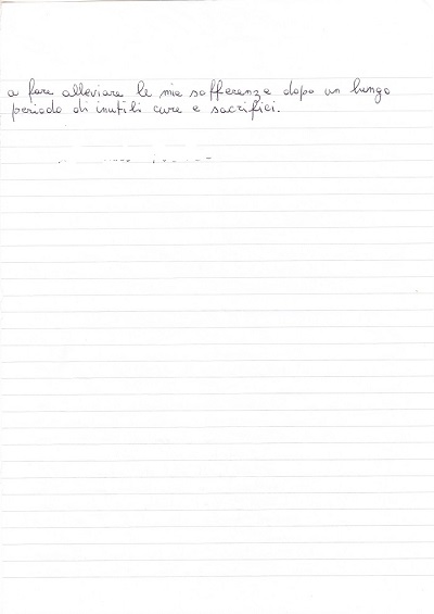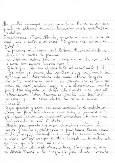 Per il resto sto abbastanza bene, ringrazio le mani di Mario Muolo e lo ringrazio per essere riuscito a fare alleviare le mie sofferenze dopo un lungo periodo di inutili cure e sacrifici.