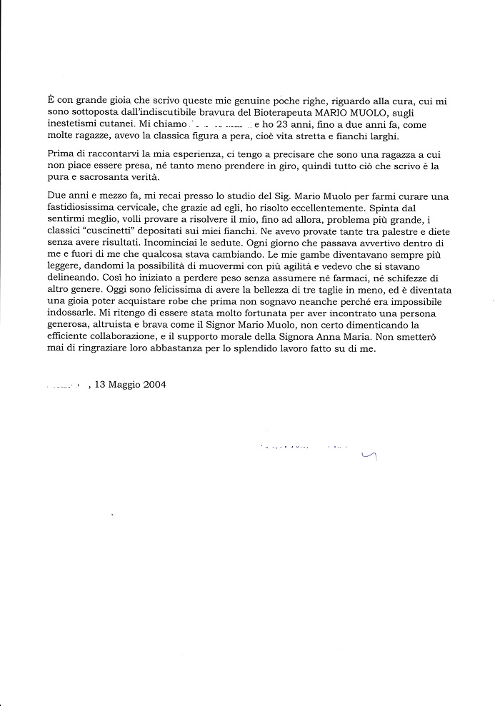 È con grande gioia che scrivo queste mie genuine poche righe, riguardo alla cura, cui mi sono sottoposta dall’indiscutibile bravura del Bioterapeuta MARIO MUOLO, sugli inestetismi cutanei. Mi chiamo … … … e ho 23 anni, fino a due anni fa, come molte ragazze, avevo la classica figura a pera, cioè vita stretta e fianchi larghi.