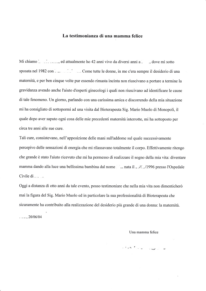 Mi chiamo … … , ed attualmente ho 42 anni vivo da diversi anni a … … , dove mi sotto sposata nel 1982 con … … . Come tutte le donne, in me c'era sempre il desiderio di una maternità, e per ben cinque volte pur essendo rimasta incinta non riuscivo a portare a termine la gravidanza avendo anche l'aiuto d'esperti ginecologi i quali non riuscivano ad identificare le cause di tale fenomeno. Un giorno, parlando con una carissima amica e discorrendo della mia situazione mi ha consigliato di sottopormi ad una visita dal Bioterapeuta Sig. Mario Muolo di Monopoli, il quale dopo aver saputo ogni cosa delle mie precedenti maternità interrotte, mi ha sottoposto per circa tre anni alle sue cure.