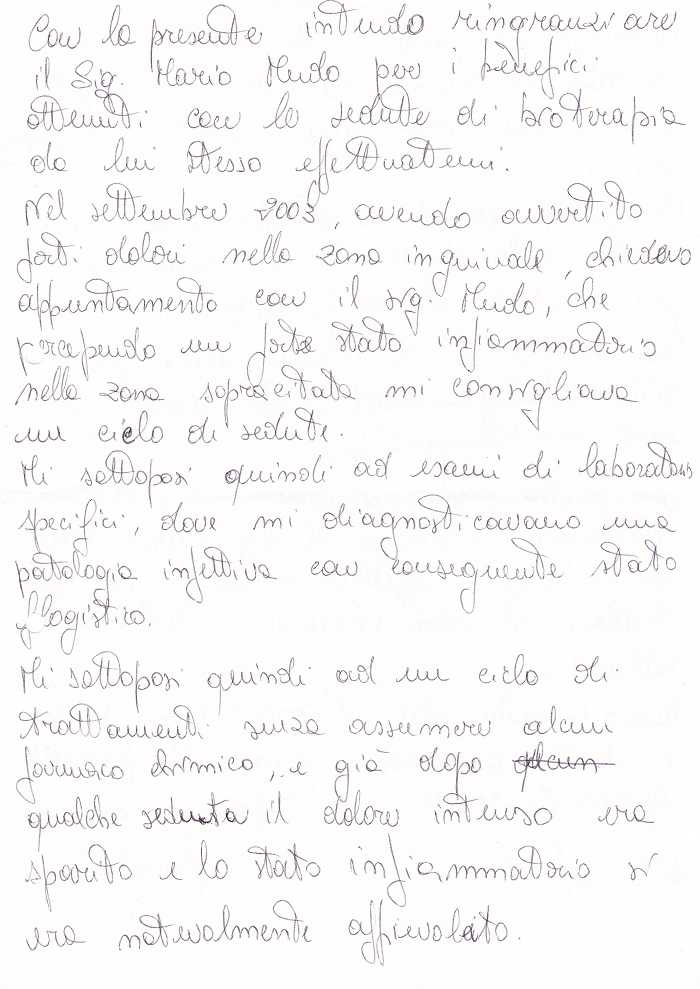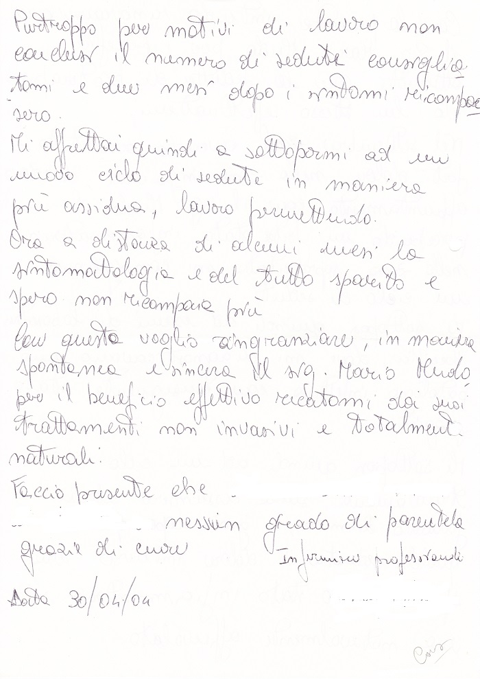 Con la presente intendo ringraziare il Sig. Mario Muolo per i benefici ottenuti con le sedute di bioterapia da lui stesso effettuatemi.
